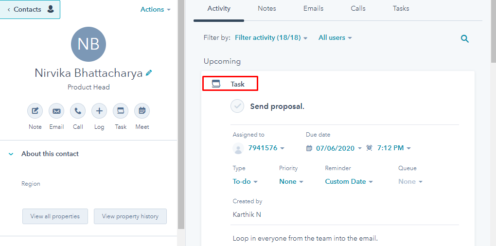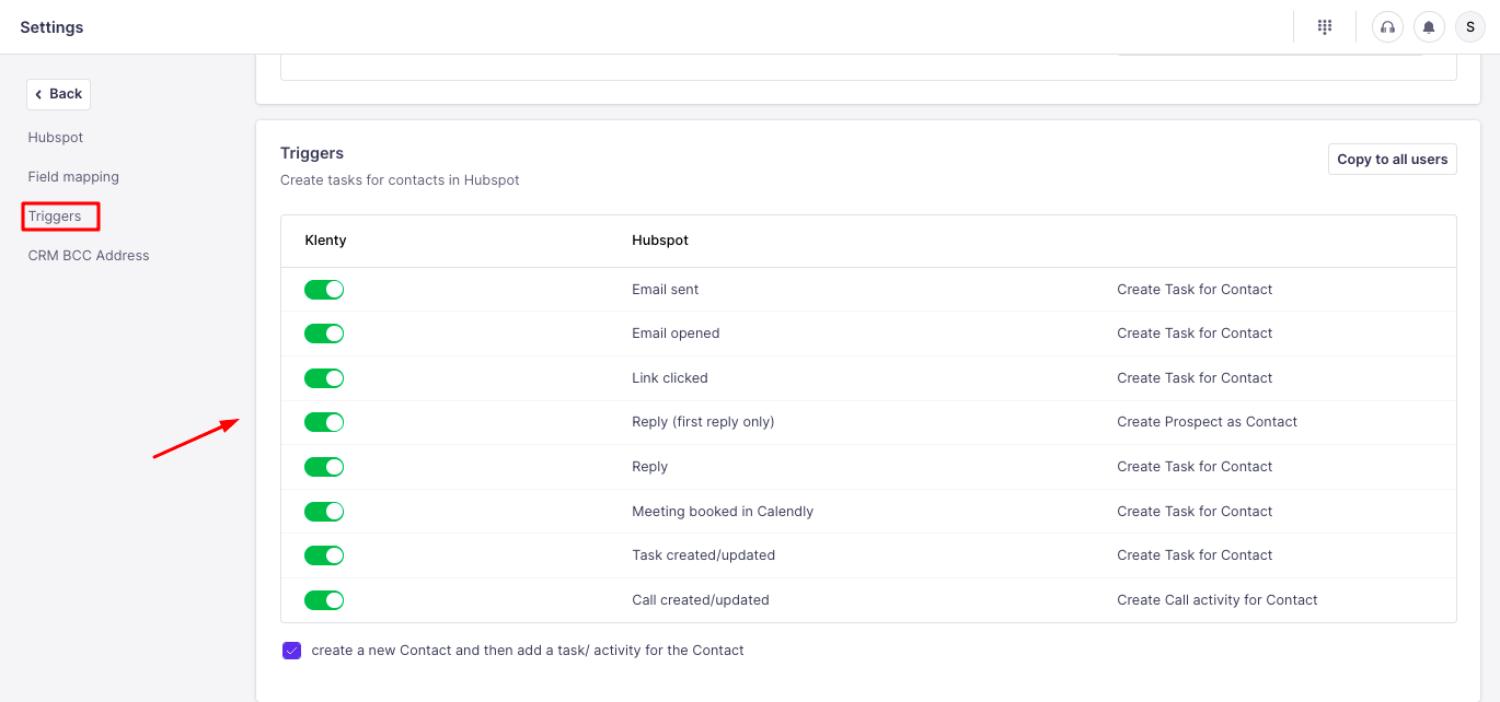 Whenever a task/ call is created for a prospect in Klenty, a corresponding task (along with the notes) gets scheduled for the respective contact in Hubspot,