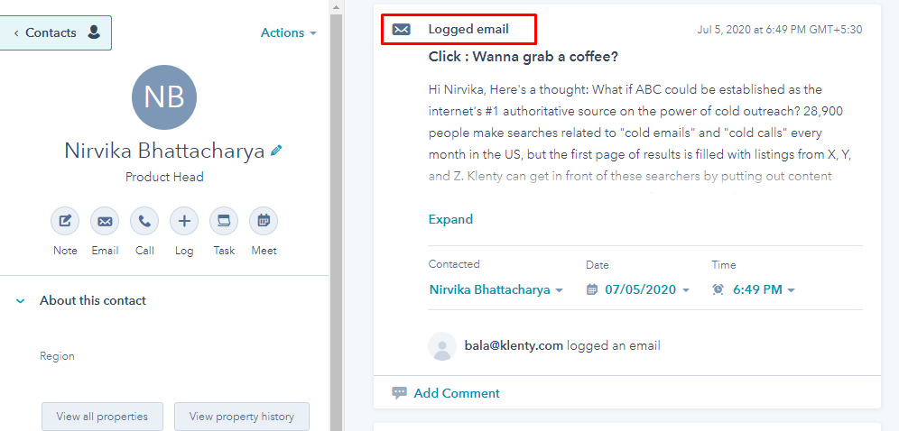 Klenty will then create these contacts in Hubspot first and then record the activity for them.