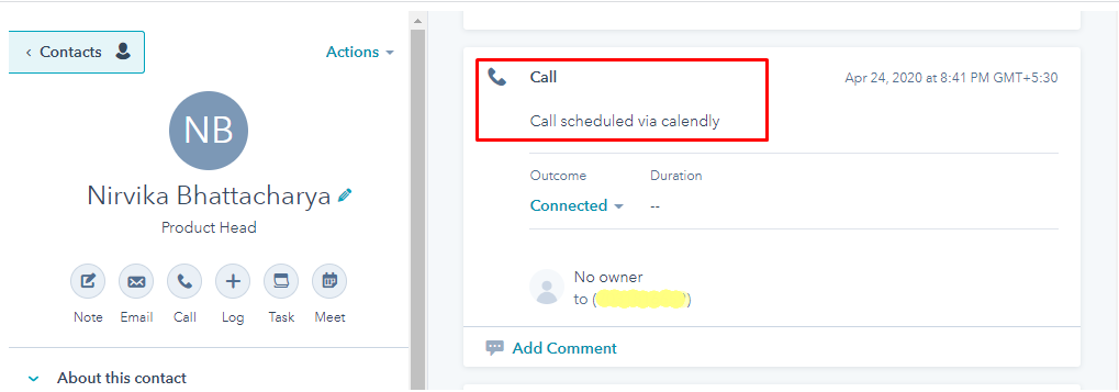 If you have integrated your Calendly account to Klenty and a prospect books a meeting with you - a call is logged for the respective contact in Hubspot,