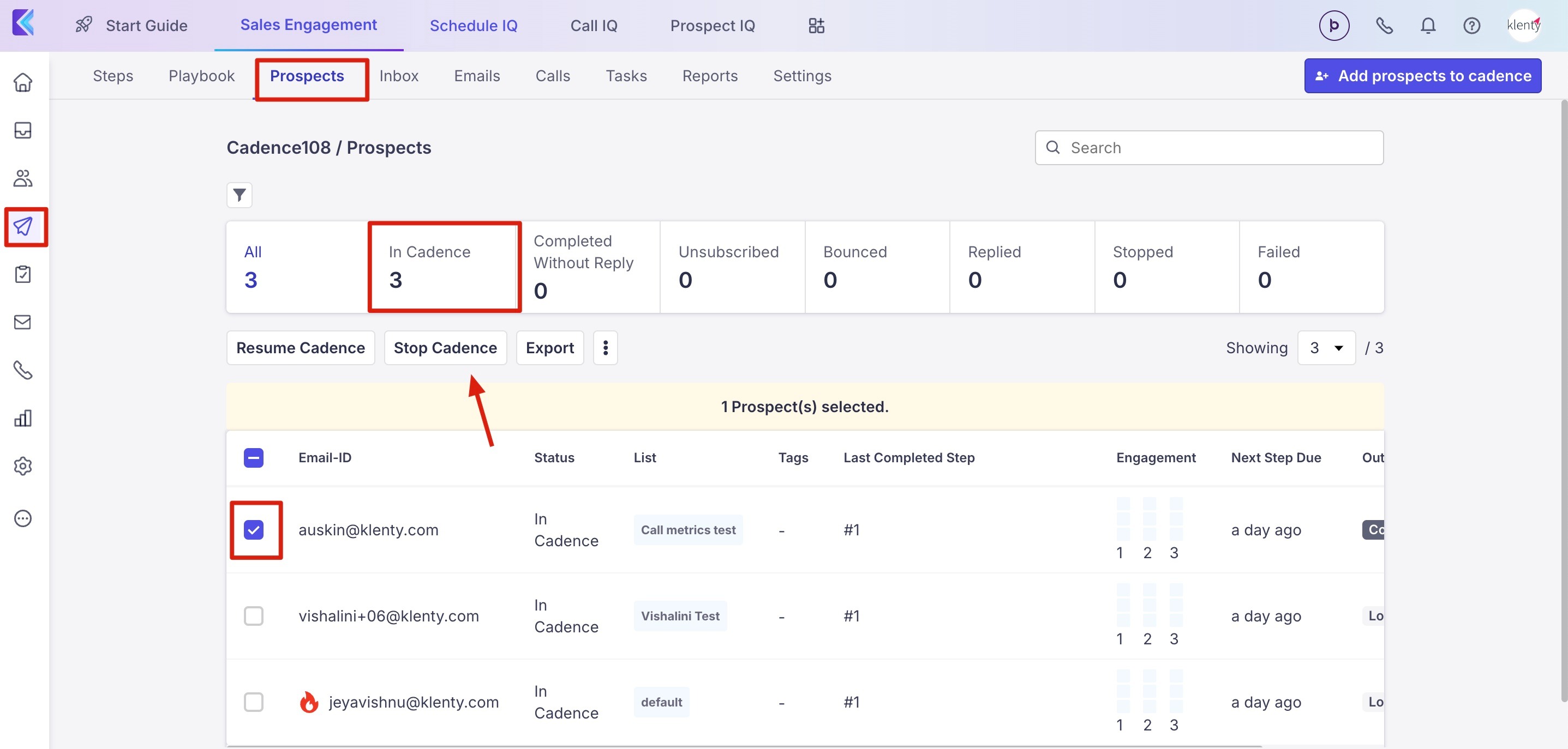 In order to stop cadence for the prospects, Open the cadence > Prospects > In Cadence > Filter(if needed) > Select All or just the required prospects > Stop Cadence