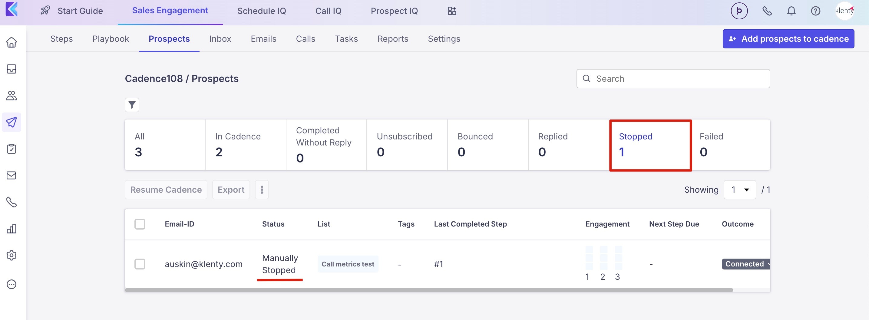 In Klenty, you cannot delete/remove prospects from the cadence altogether once you have added them. But you will be able to stop the cadence for the prospects, which is equivalent to deleting/removing them from a cadence.