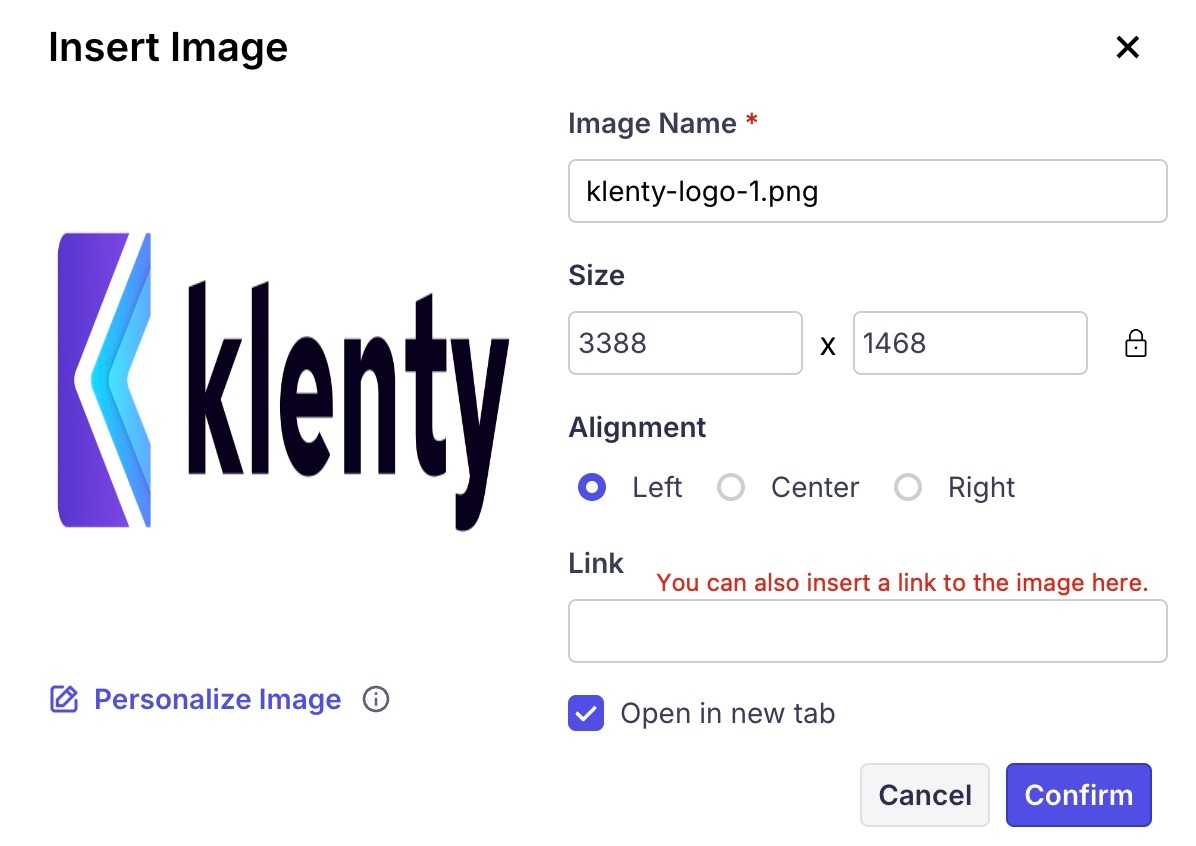 After selecting an image from your computer, you can name it, resize it, align it, and even add a link. This way, when the image is clicked, it will redirect to the hyperlinked number.