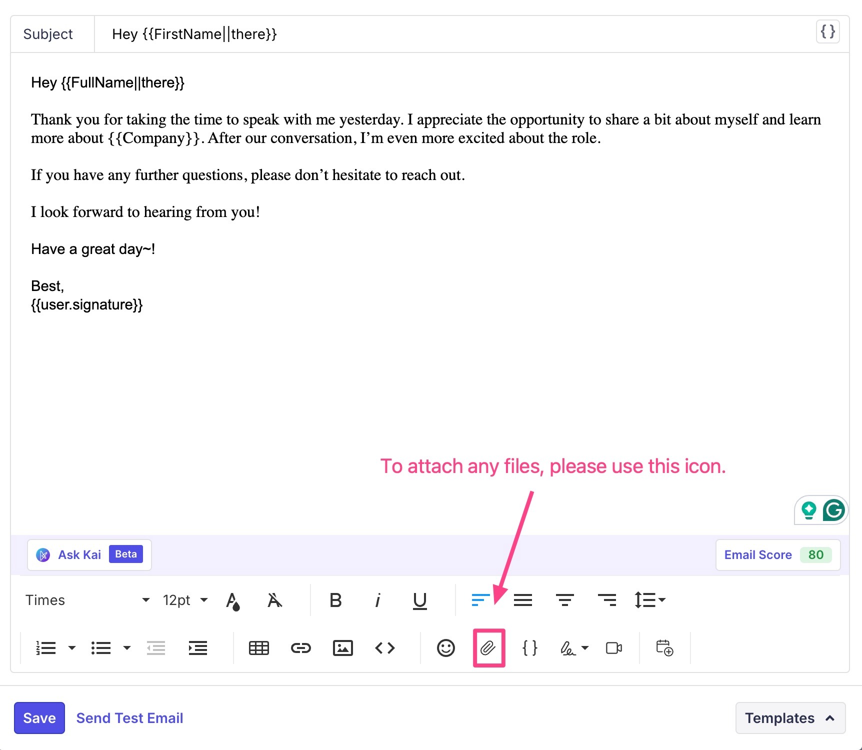 So, if you want to attach a Word document(.docx), you would have to first convert it into a .pdf file and attach it. Also, each attachment can be a size of 5MB, and overall, the size of the attachments can be 12 MB in a template.