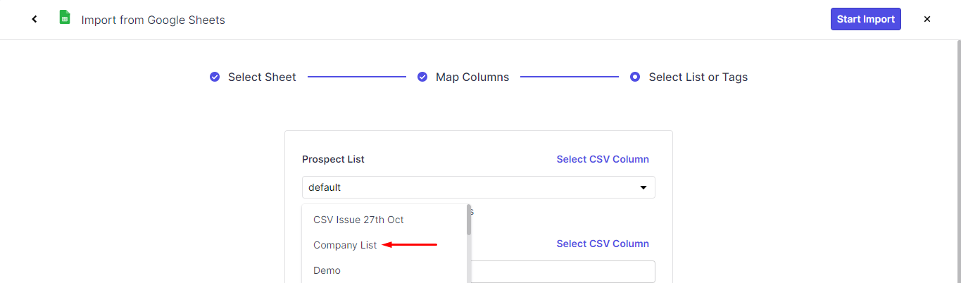 While importing prospects, specify the list name. You can either enter a new list name or choose an existing list.