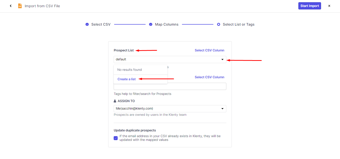 On hitting "Start Import," Klenty will create dynamic lists based on the criteria you chose. You can find these lists on the "Prospect" page.