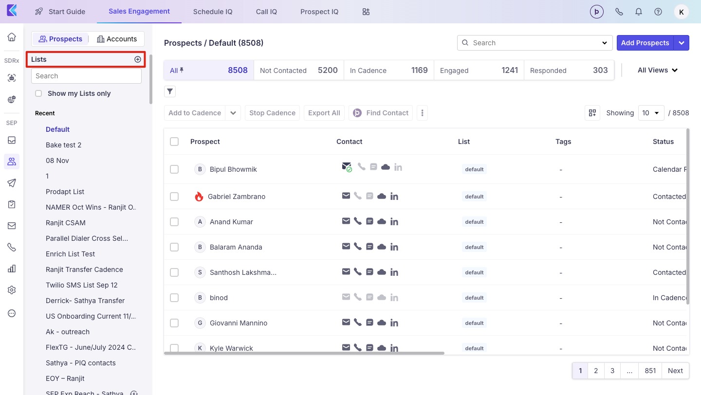 Create "Lists" in Klenty to quickly search for the set of prospects you'd like to start a cadence with. You can filter prospects based on the "List" name and selectively add them to a cadence.