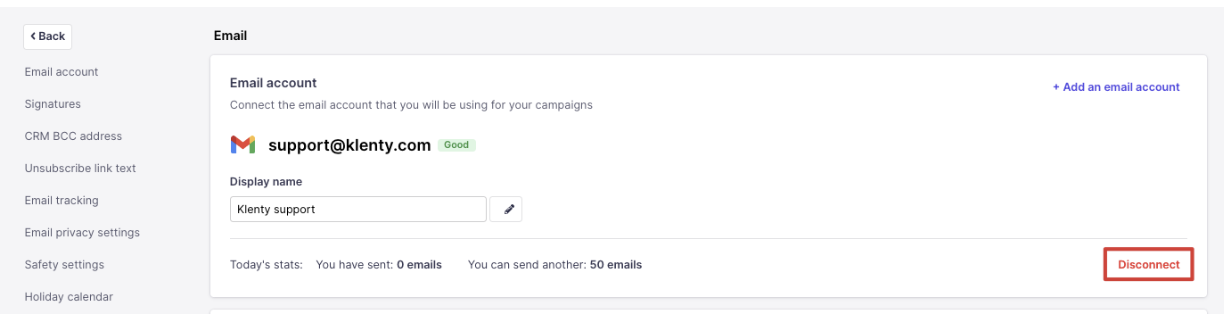 To swap the email account, head to Settings > Email settings > Email Account > Disconnect,