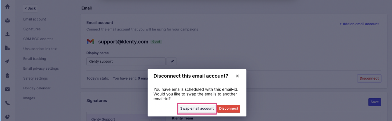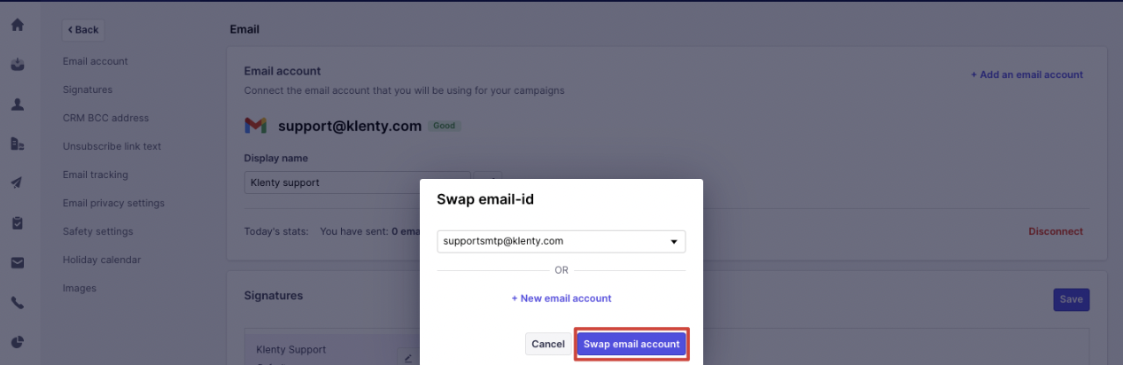Please note that the Swap option will not be reflected if there are no scheduled emails connected with your Klenty account.