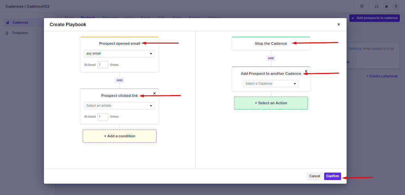 You can set up more complex workflows by adding multiple conditions to filter prospects and move them to a new cadence (or any other action).