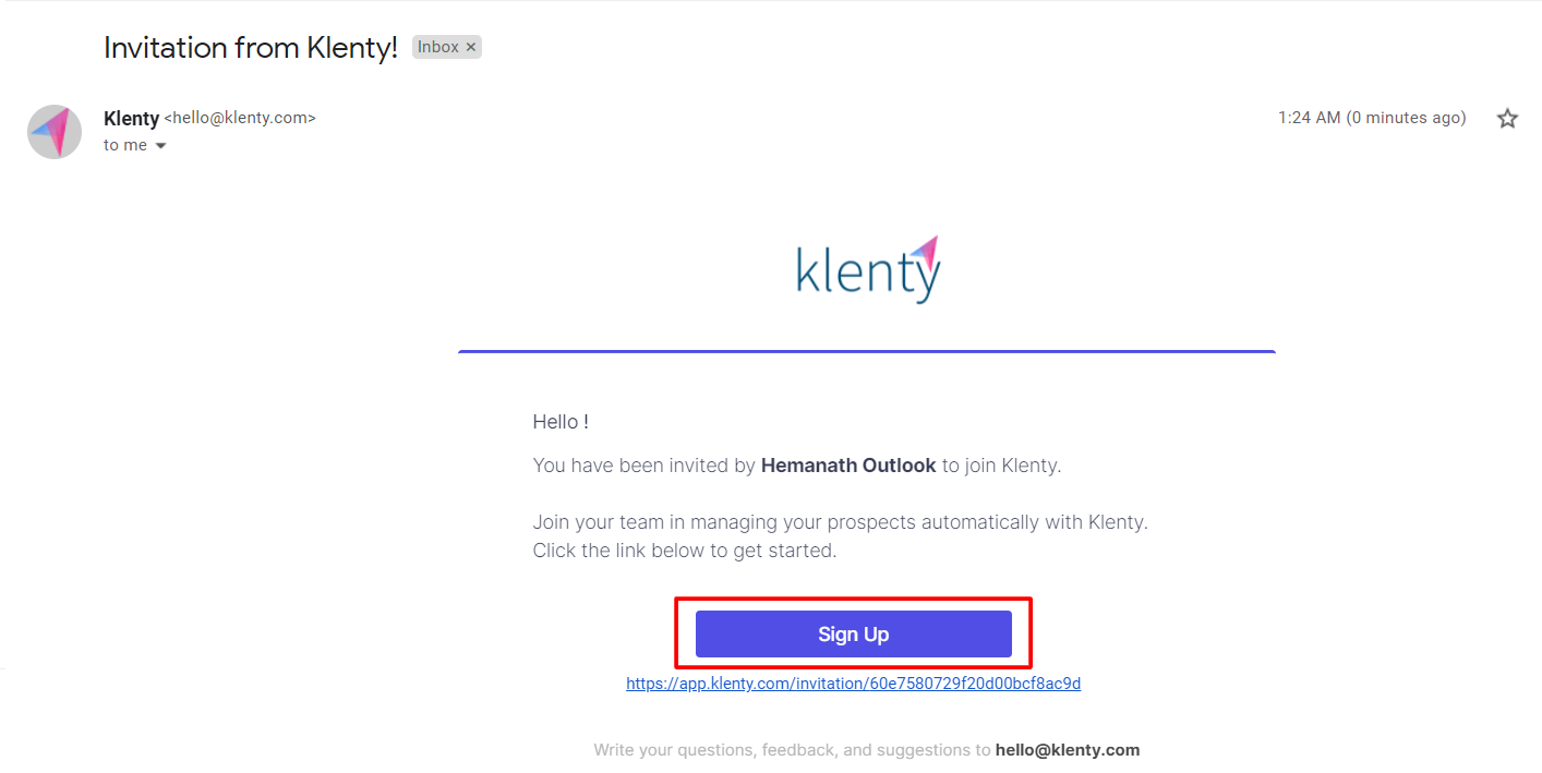 Your team member will now receive an email from Klenty asking him to sign up. That will add them to your team in Klenty.