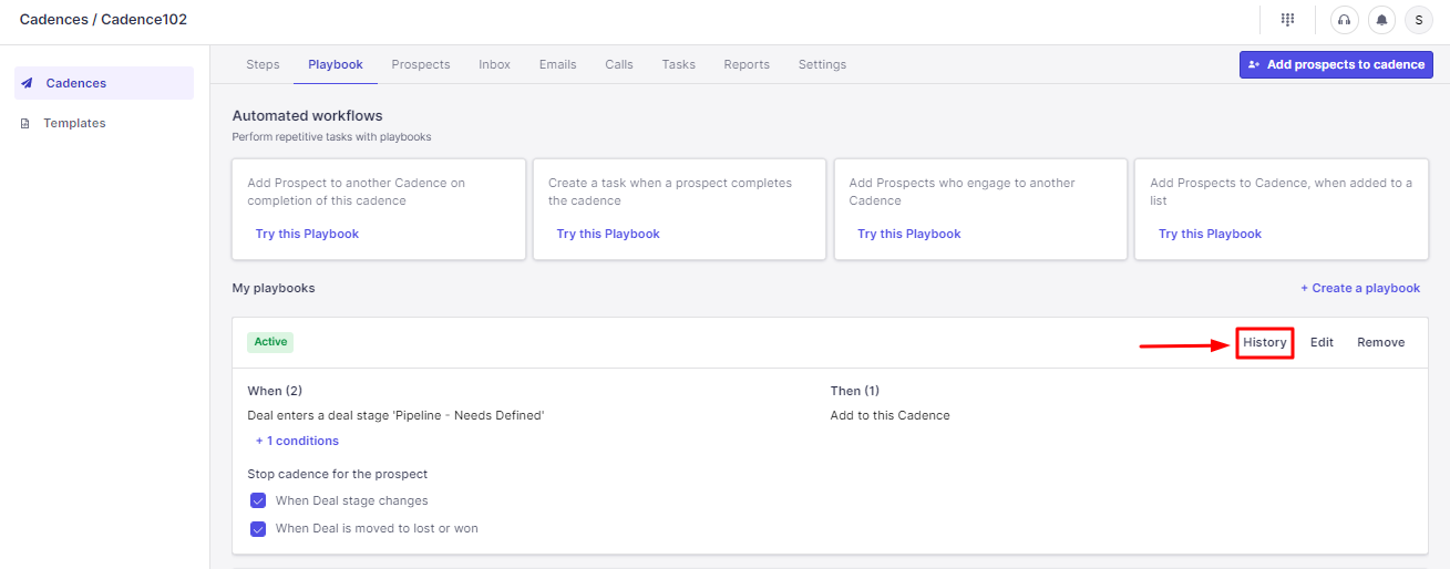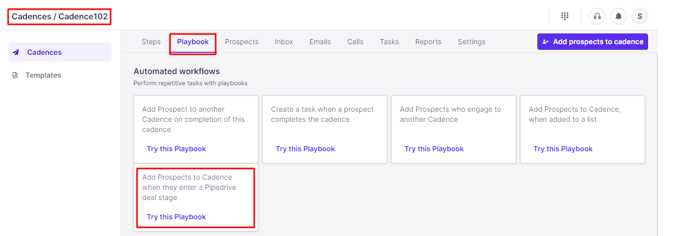 To set this up, head to the "Playbooks" section inside your cadence > Try the Playbook "Add Prospects to Cadence when they enter a Pipedrive deal stage".