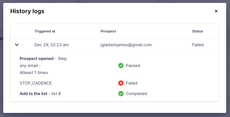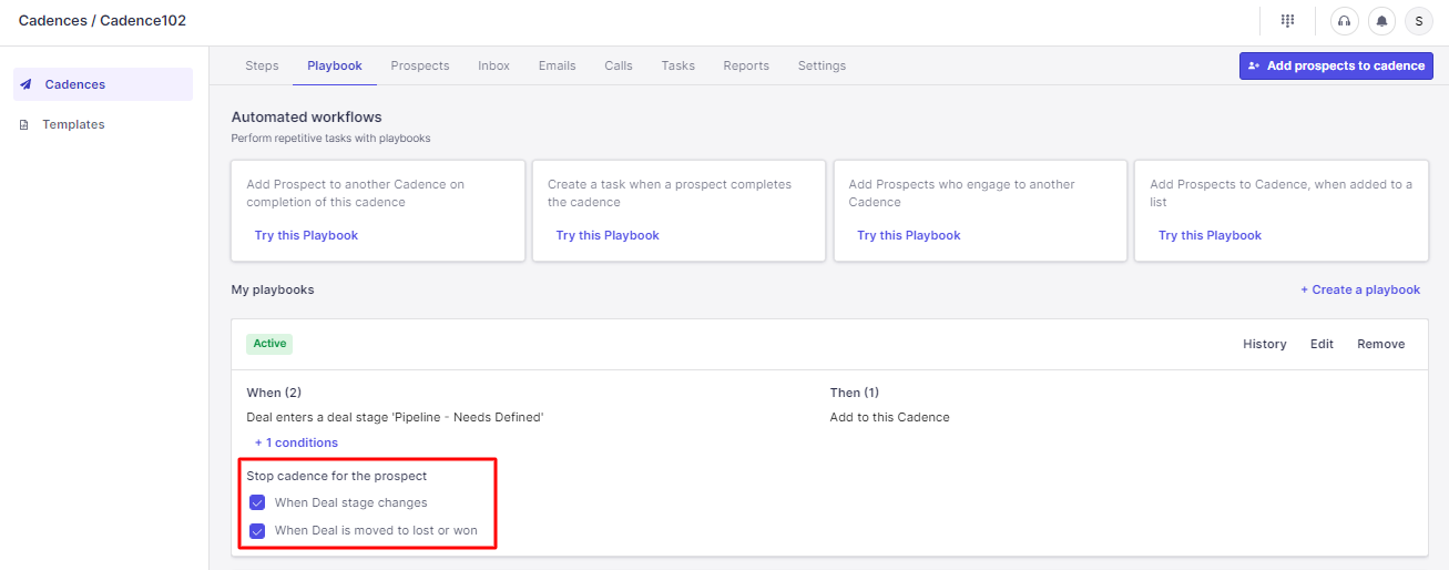 You can choose to stop the cadence when the deal stage changes or if it is marked as lost or won: