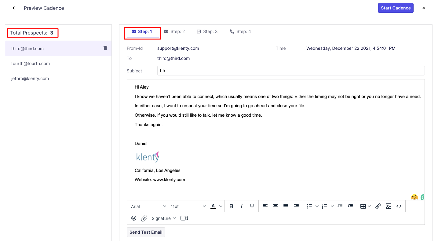 You can then check how the Cadence is looking for this prospect - replace the placeholders with the corresponding field values - for Klenty to launch the Cadence for this prospect.