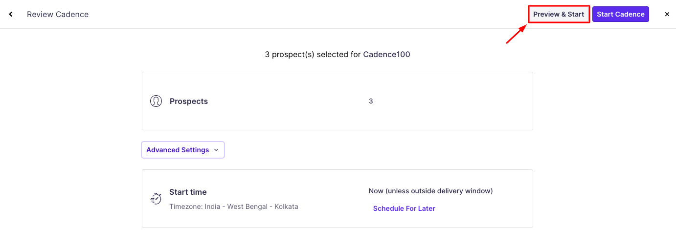 One such way is via the "Preview and Start" section. Before you launch the Cadence, you can preview how the Cadence is panning out for each of your prospects.