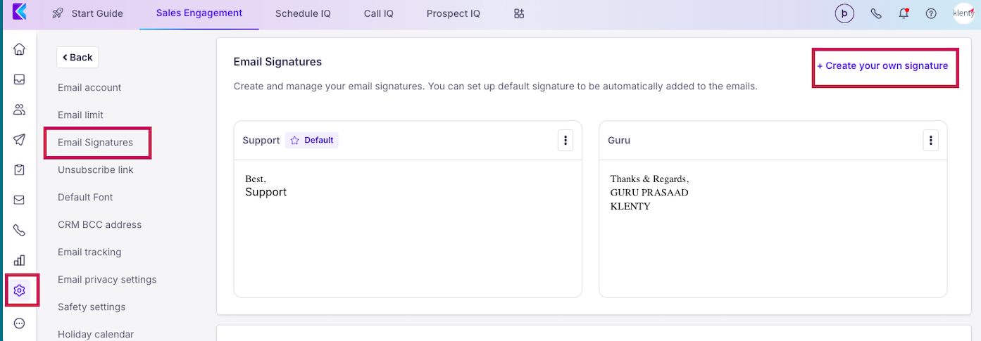 Head to Settings > Email settings > Signatures > click on Create new > give a signature name and check the 'Default' checkbox if you'd want to set the signature to be default one,