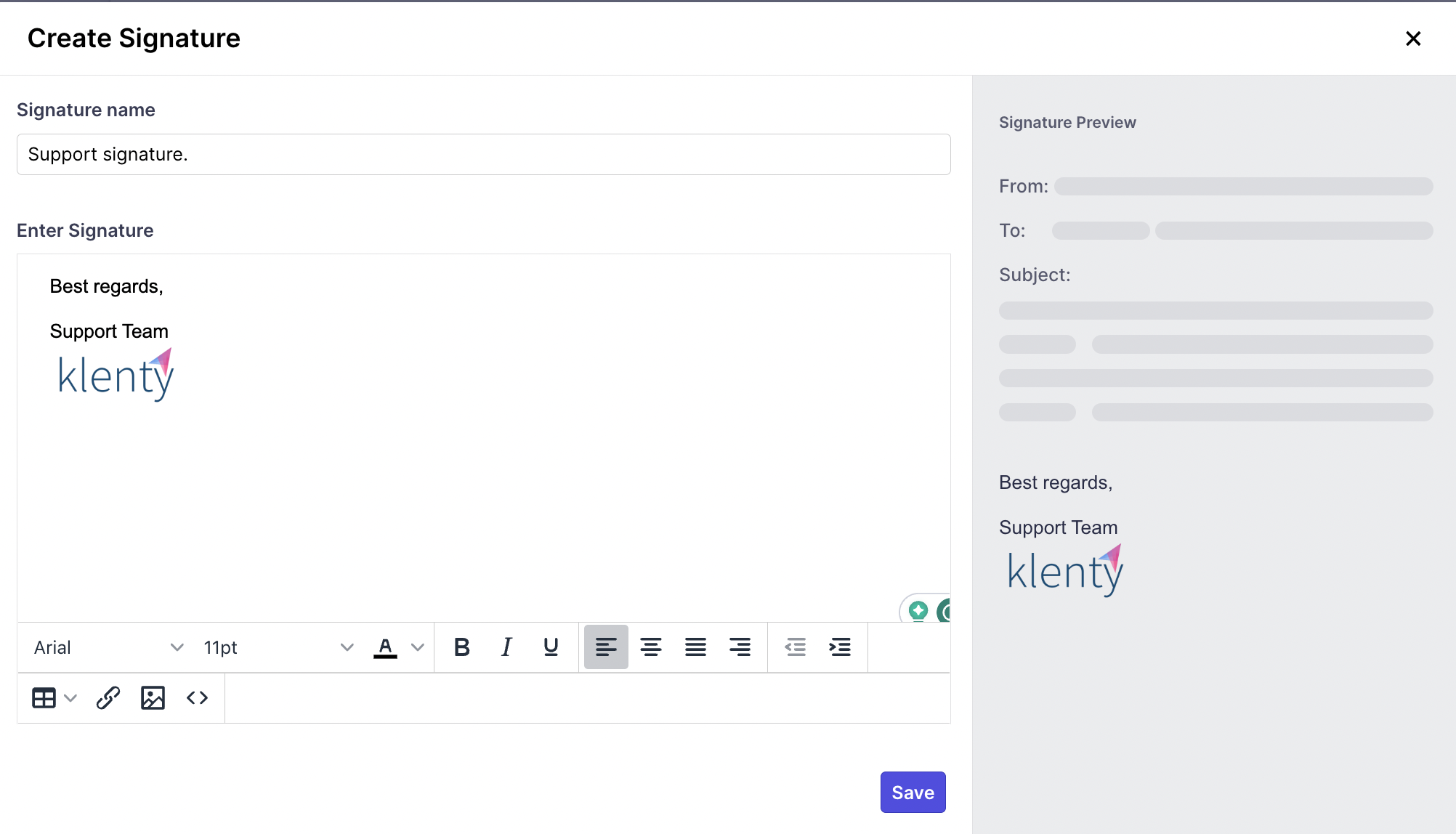 Then, add in the signature body (customize it using the formatting options) and Preview the signature before hitting Save.