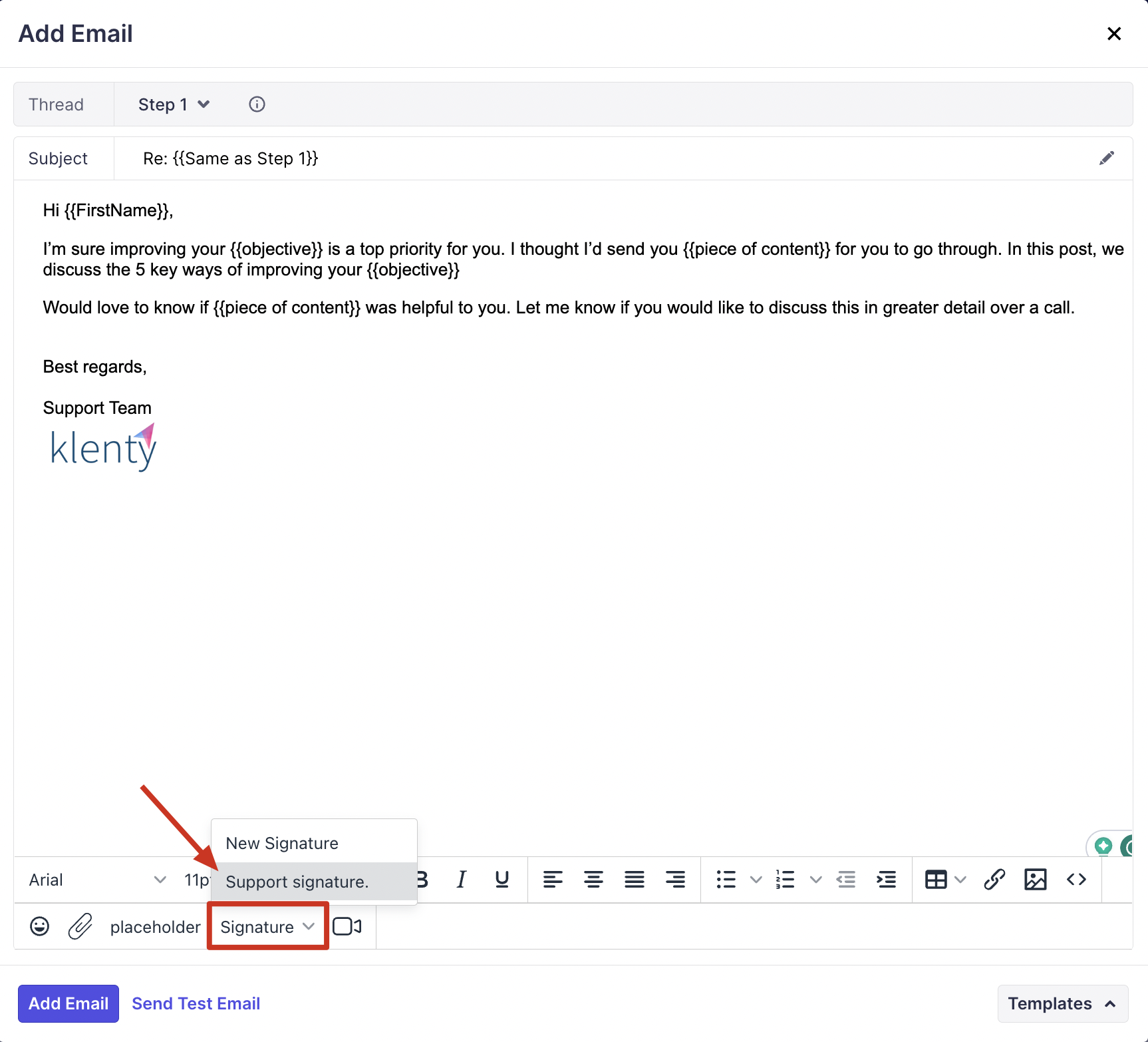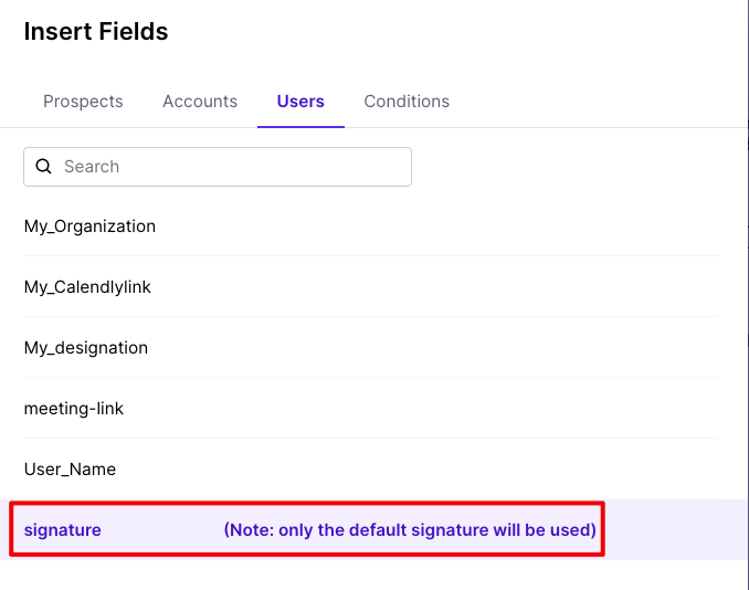 Head to the cadence > In the email composing window, click on the Placeholder icon > head to the User tab > choose Signature.