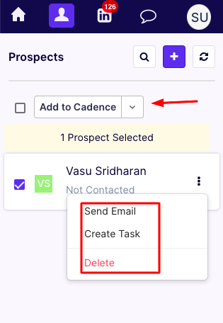 2. After pushing a contact, you have the options to add it to a cadence, send an email, create tasks, and delete the prospect