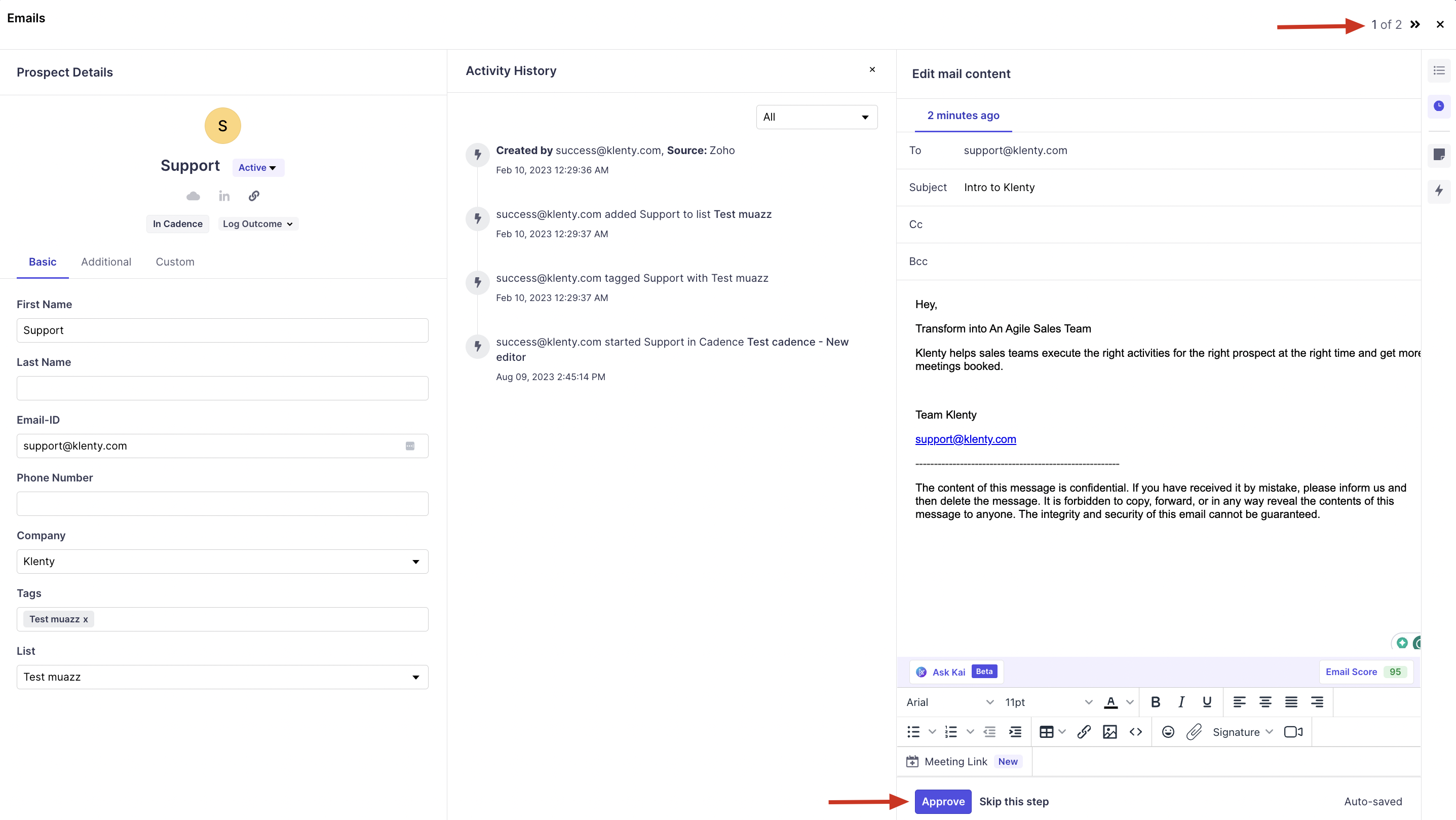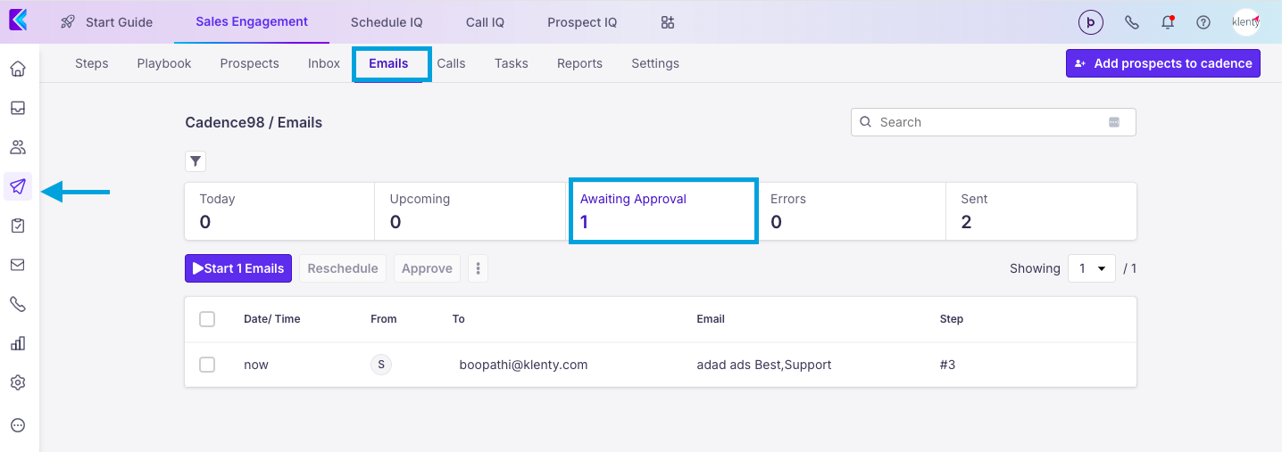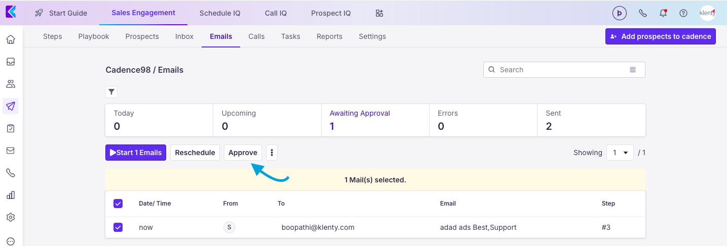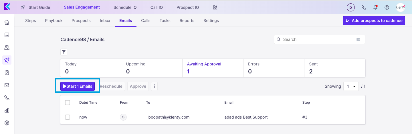 If you want to approve all the emails in the awaiting approval section, hit the option "Start 2 Email" (number 2 changes based on the total number of emails you have in your cadence),