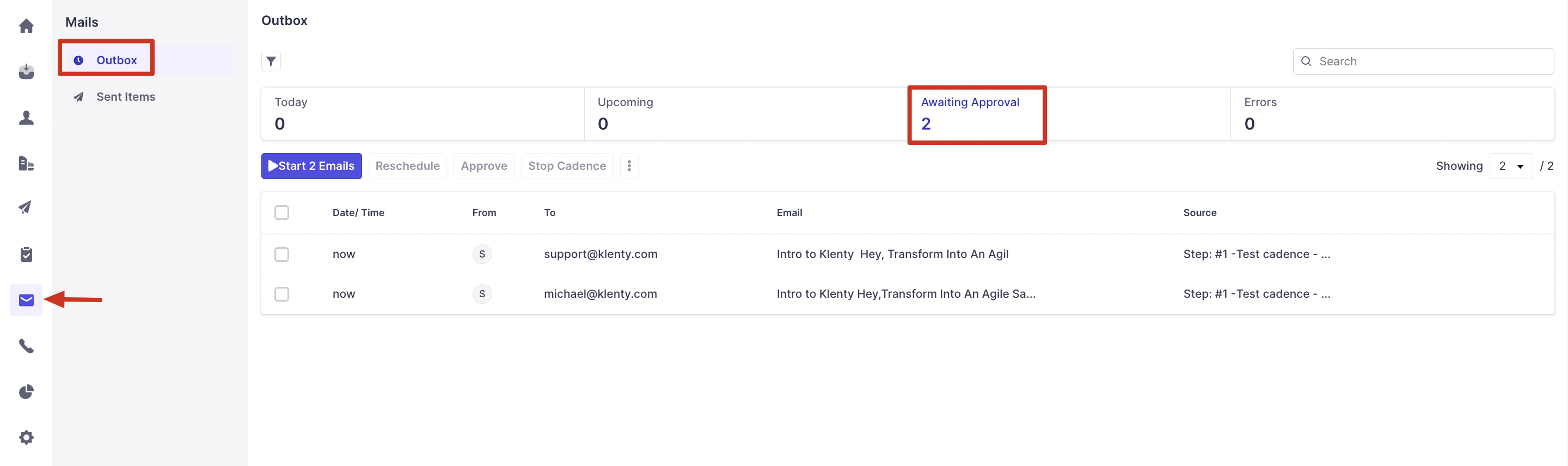 Note: The difference between approving emails from within the Cadence and the Outbox is that you can see emails from all the cadences waiting for your approval in the Outbox section, whereas the Cadence's Awaiting Approval section displays emails only specific to it.