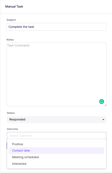 The outcome can be marked for a completed task only if the status is marked as Responded. This can be marked from the Tasks page,