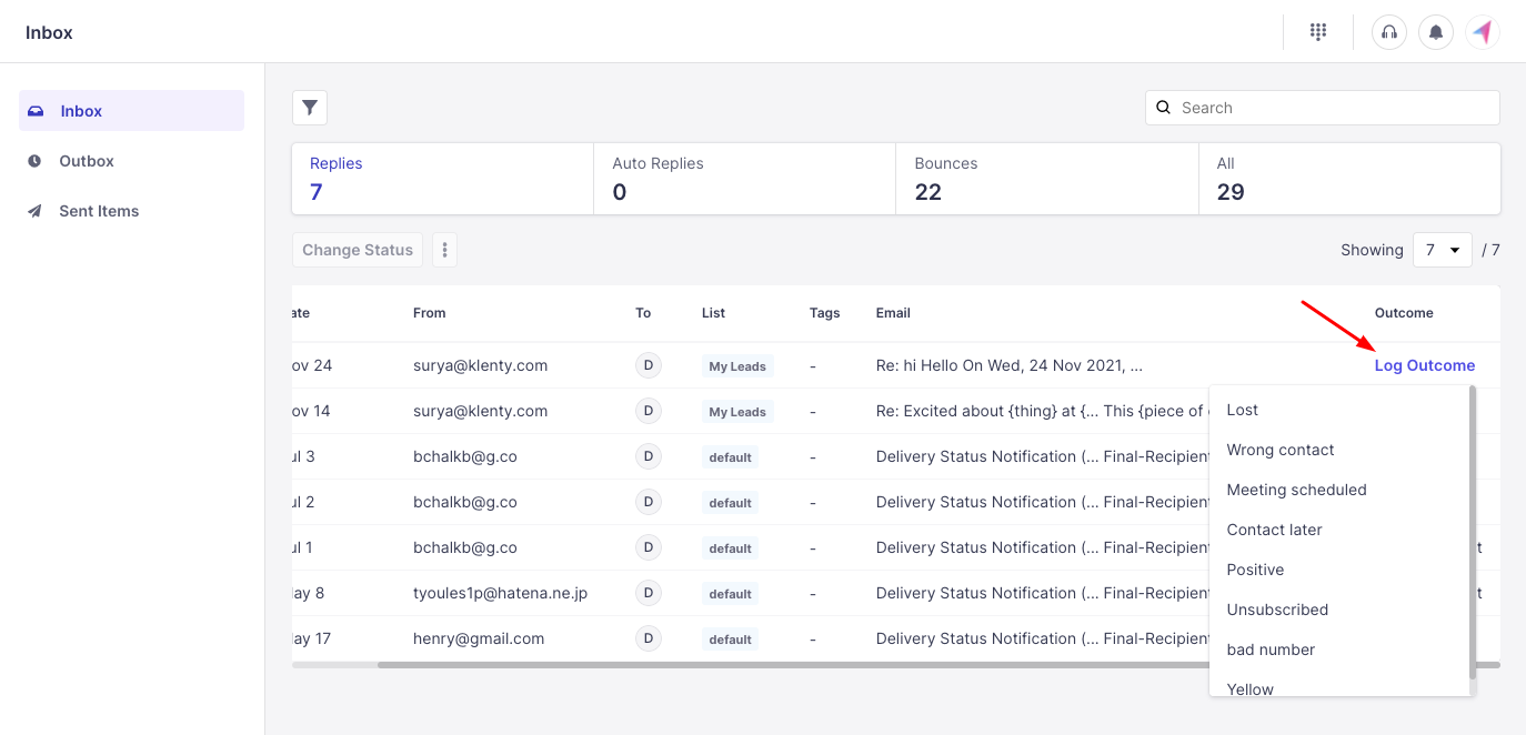 You can log outcomes for the responses you receive from your prospects in the Inbox section (available on the main Inbox page and within the cadence inbox),