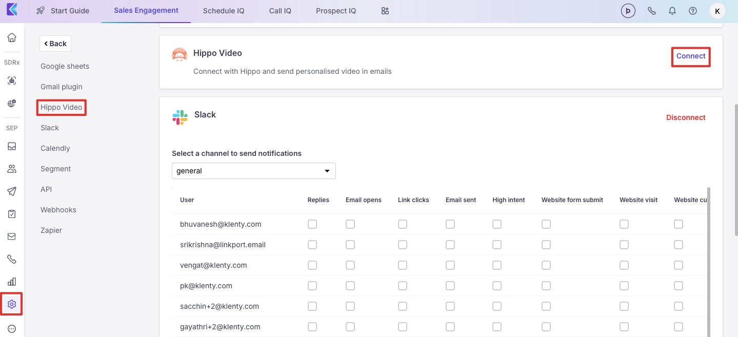 Once access is provided, you can find the Hippo Video connected to Klenty.