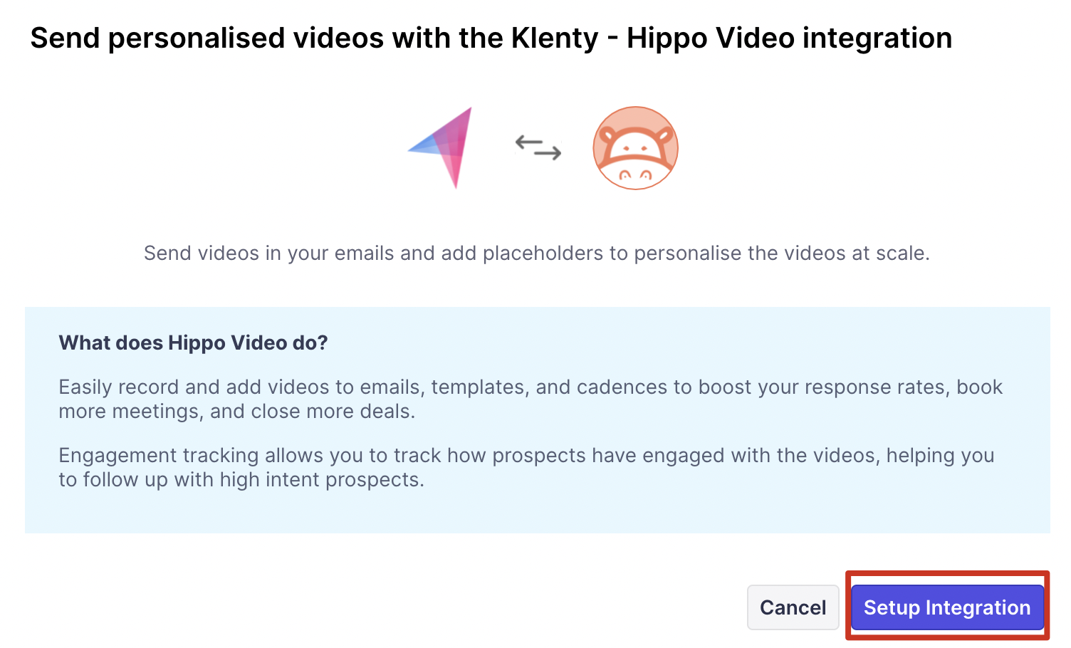 Currently, you can only integrate a Hippo Video account having the same username (login email ID) as that of your Klenty account. For e.g., if the login email ID of your Klenty account is hello@klenty.com, you can only integrate a Hippo Video account having the same login email ID – hello@klenty.com.