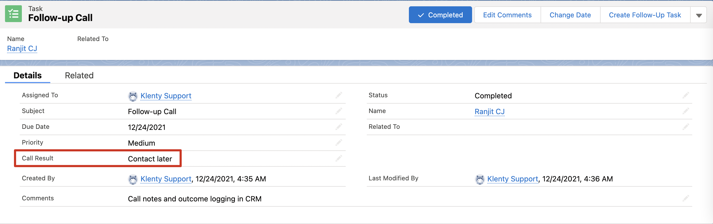Note: For Salesforce, you would first need to enable a field called Call Result from your Salesforce settings.