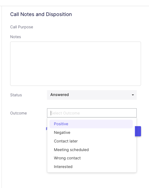 Once you save a call, its outcome can be logged, if the status is set as Answered. This can also be done from the Main Calls page > Completed section or from within the Cadence > Calls section.