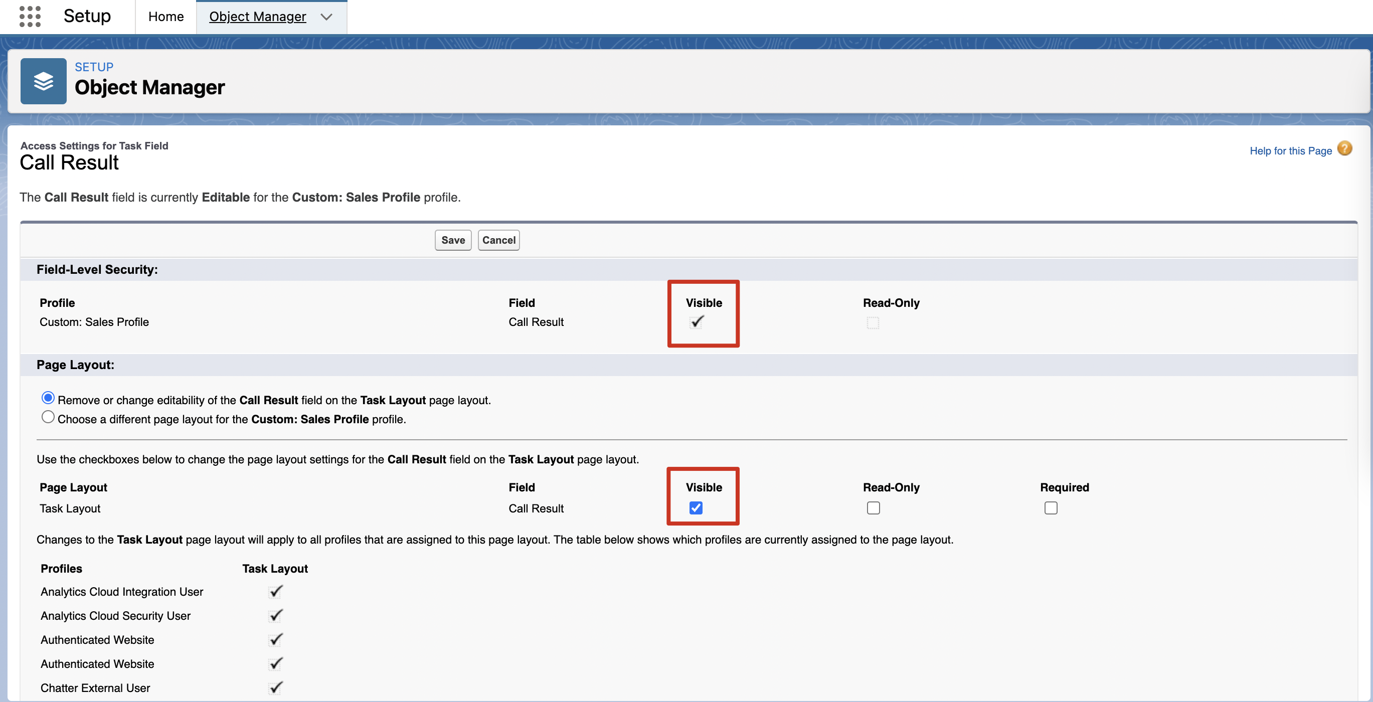For the same, head to Setup > Settings > Security > Field Accessibility > Task > View by Fields > Field = Call Result > Custom: Sales Profile > Editable > Check the box - Visible > Save. PFB a screenshot.