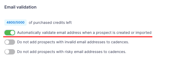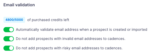 Head to the Settings > Deliverability > Email validation > turn the toggle on for "Do not add prospects with invalid email addresses to cadences" and "Do not add prospects with risky email addresses to cadences"