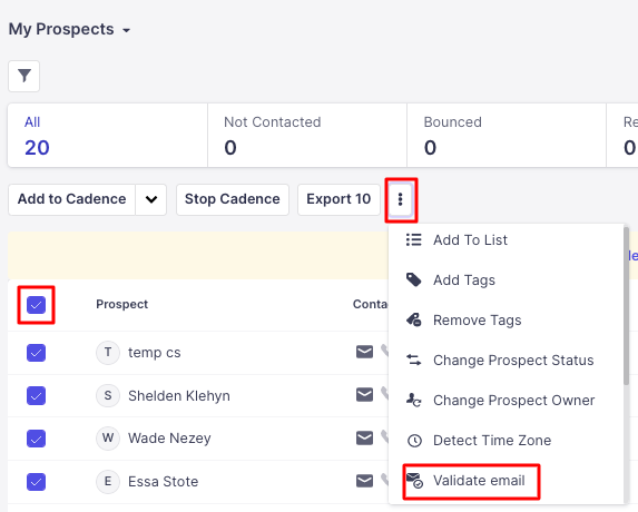 To validate existing prospects manually, select the prospects that need to be validated > click on the three dots and hit 'Validate email',