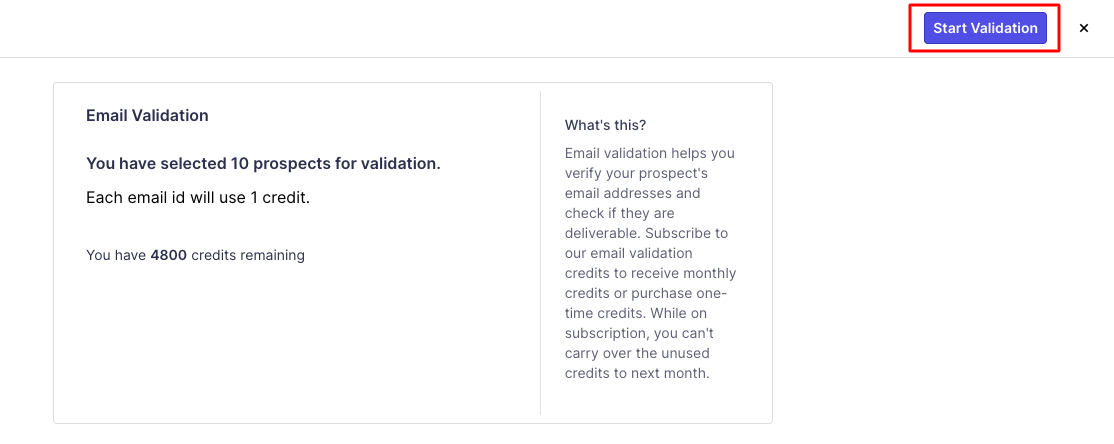 There will be another step of confirmation, where you can see how many emails ids are in the queue to get validated and the remaining available credits in your subscription. The process begins once you hit "Start Validation".