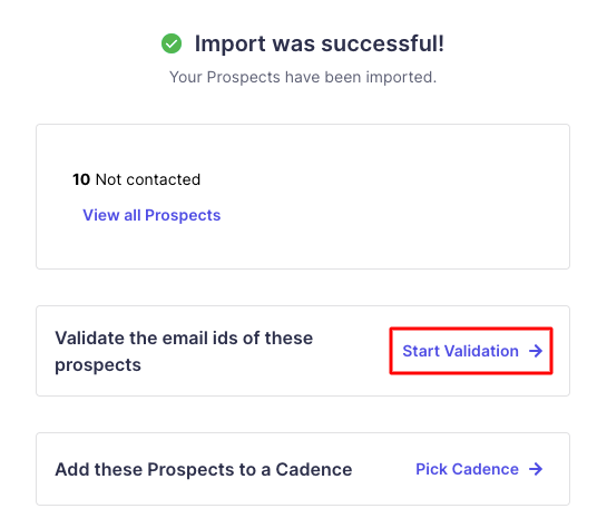 To validate newly imported prospects, choose the option "Start Validation" once the import is completed,