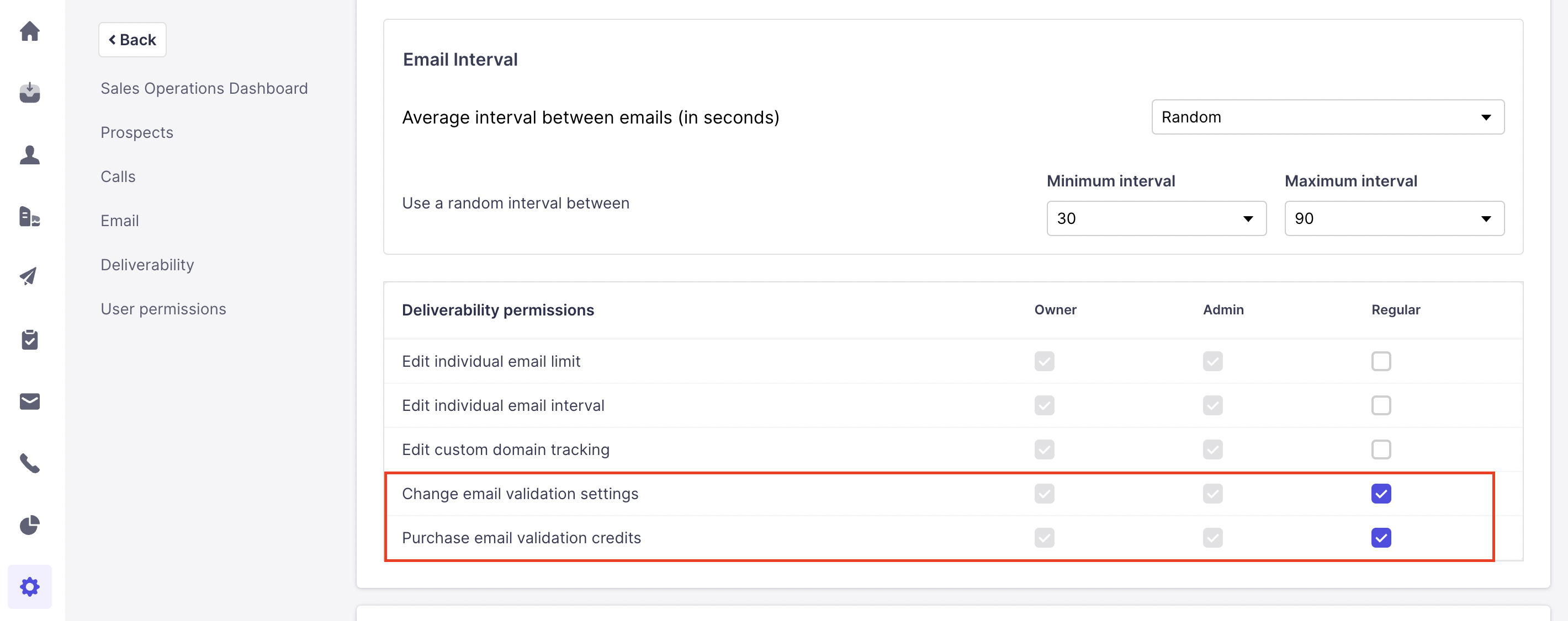 The above-mentioned permissions will be enabled for both Owner and Admin by default. However, for regular users, either the owner/ admin can enable it for them so that, the regular users will be able to have access to make changes to the email validation settings or be able to purchase email validation credits.