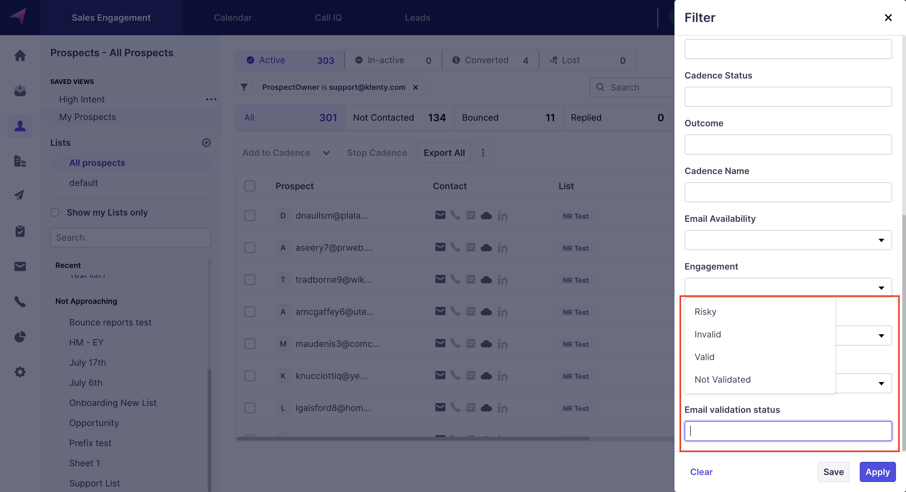 On the main Prospects page, click on the filter button and scroll down to "Email Validation Status". The same filter can be found inside the Cadences > Prospects tab. You can filter the prospects here based on the 4 statuses