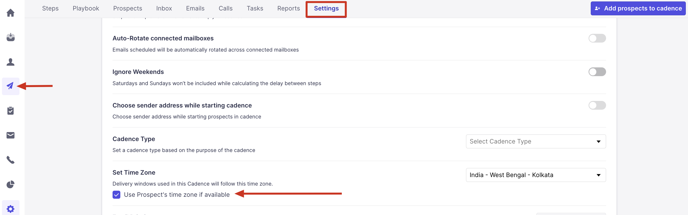 The next step is to reach out to them after detecting their time zones. To do this, you can head to the Cadence > Settings > check the box 'Use Prospect's time zone if available.' Your emails, tasks, and calls will be scheduled based on the prospect's time zone.