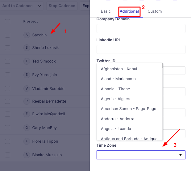 It is also possible to set the time zone manually by selecting the time zone from the time zone drop-down field. Click on the prospect's name > head to the 'Additional' column > choose a timezone,