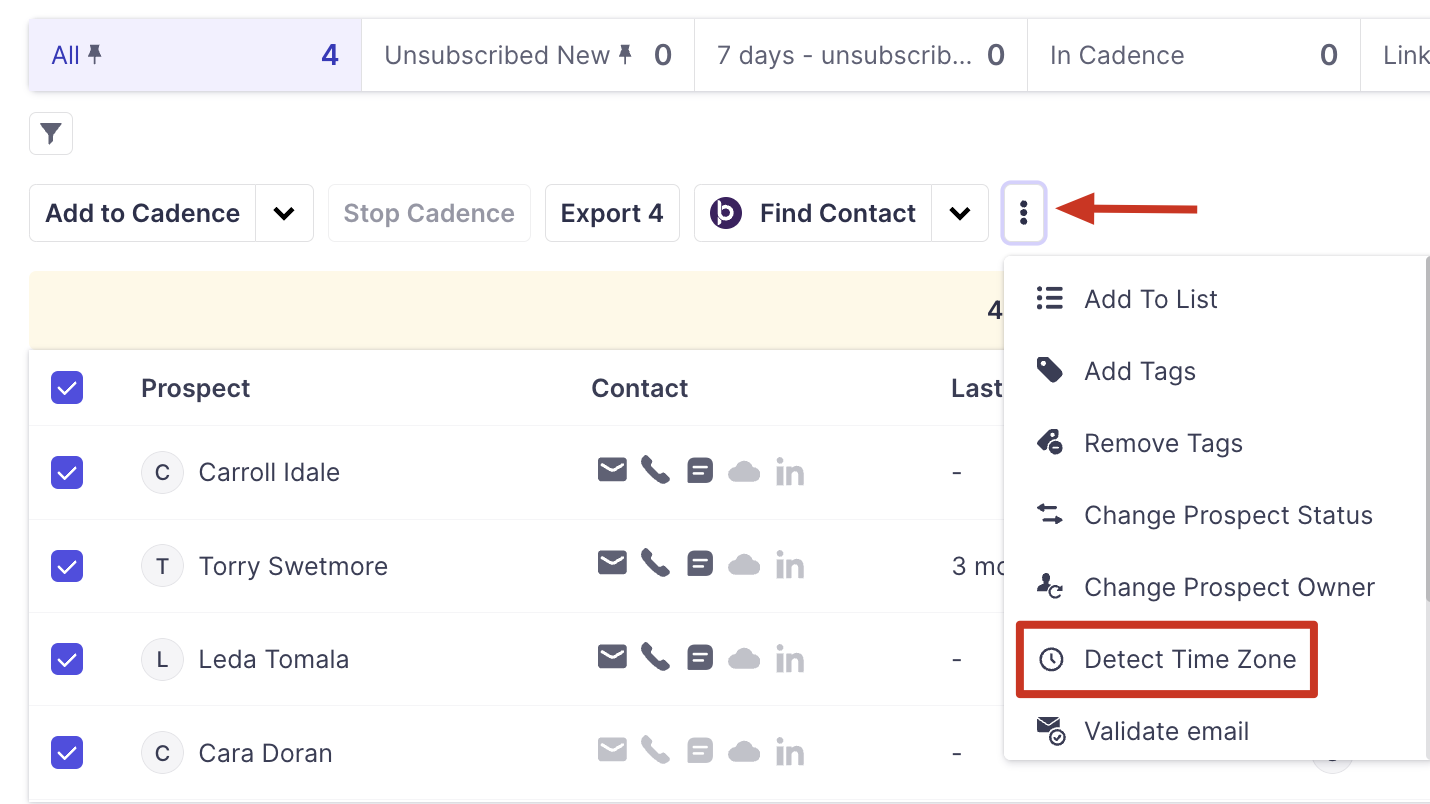 For existing prospects: The option is available in Prospects > three dots > Detect Time Zone,