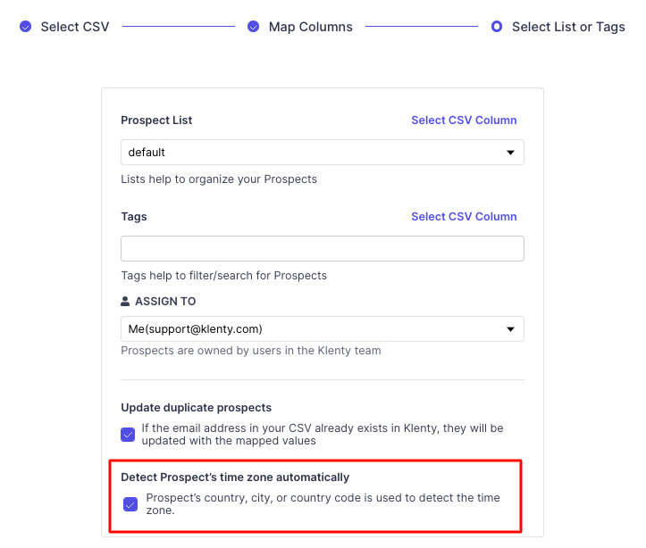 For new prospects: An option to detect the time zone of the new prospects is provided while importing them. You can check/ uncheck this option,
