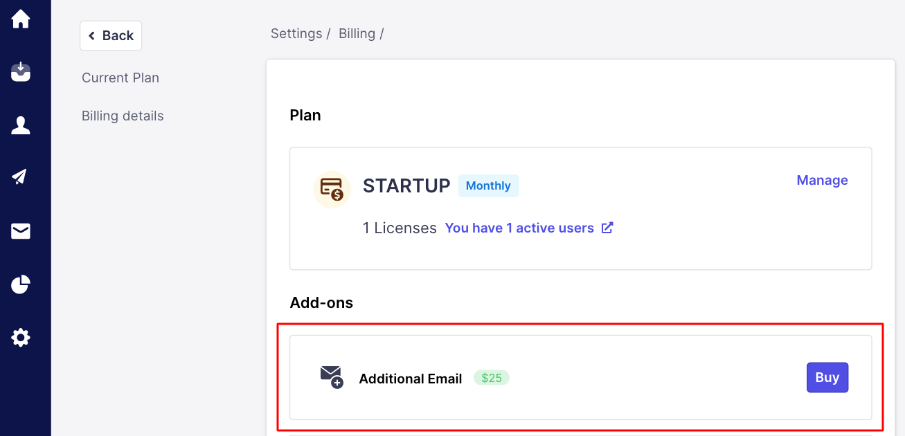 Note: Pricing of an add-on depends on the plan you are currently in and an email add-on is a team-level setting. Purchase of an add-on will be applied to all the users in your team.