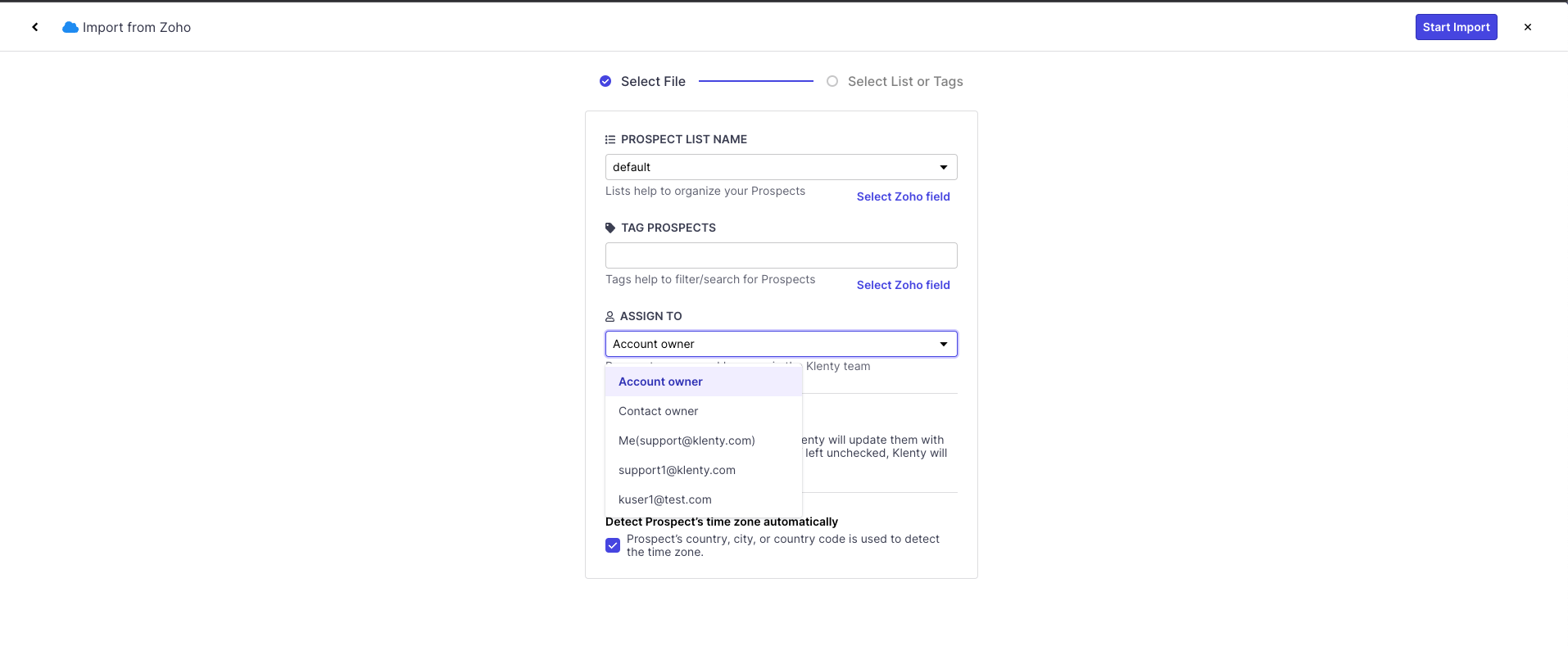 After you select the Import option, decide on the List name, Tags, and ownership of the Prospect as the Account owner.