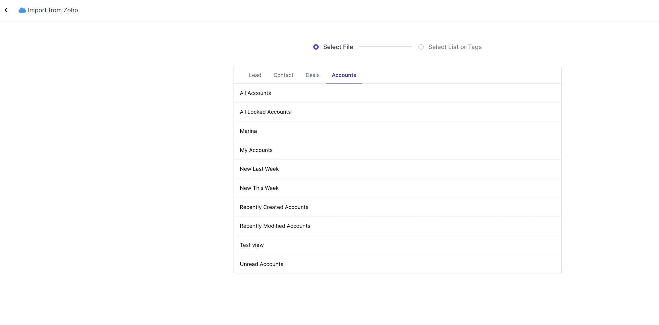 Select the option " Account" to import all the Contacts of the respective Accounts in the CRM. This presents all the Accounts filters created in Zoho you wish to import.