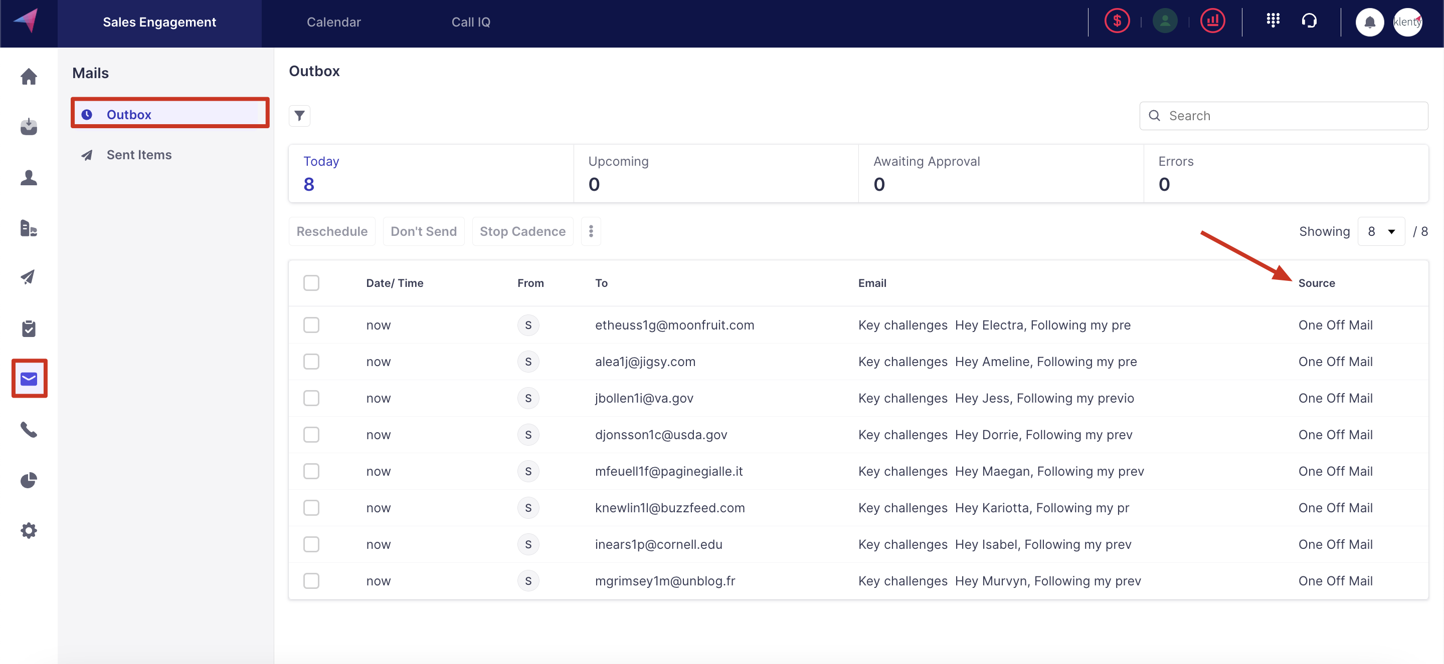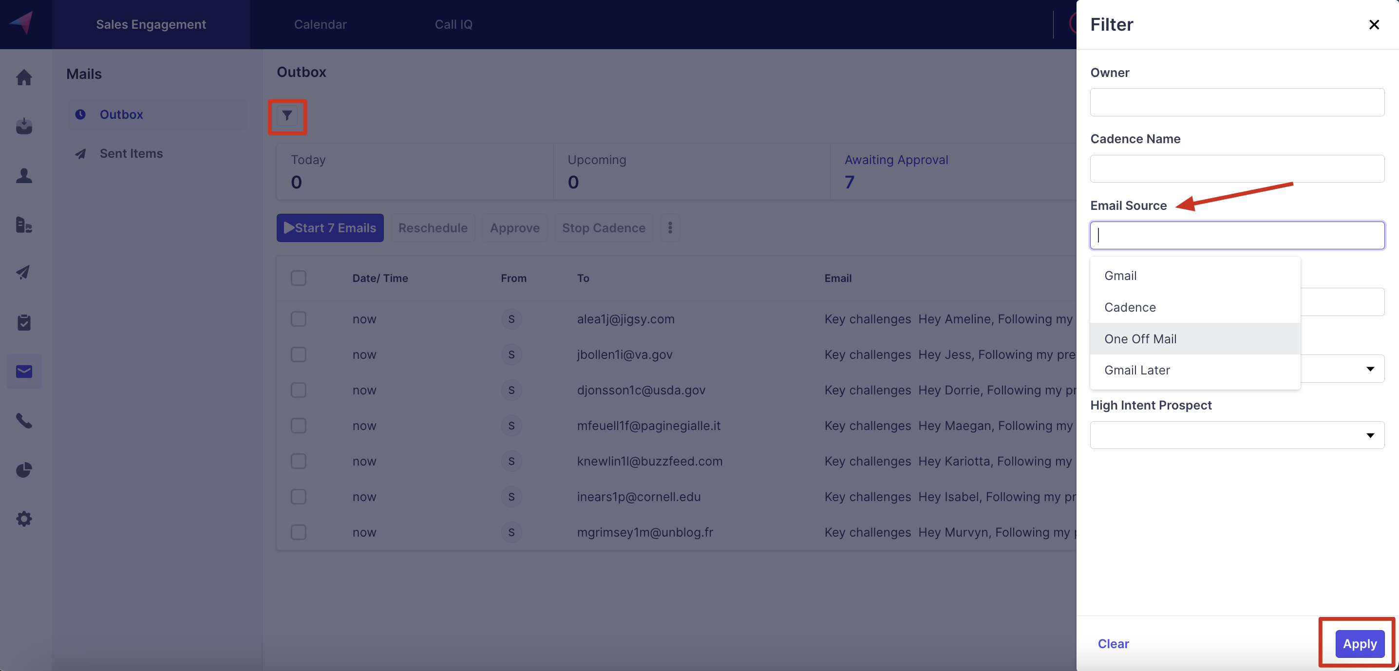 When you have multiple emails queued up which includes cadence emails as well, you get to filtarize the emails by source as - One-Off Mail