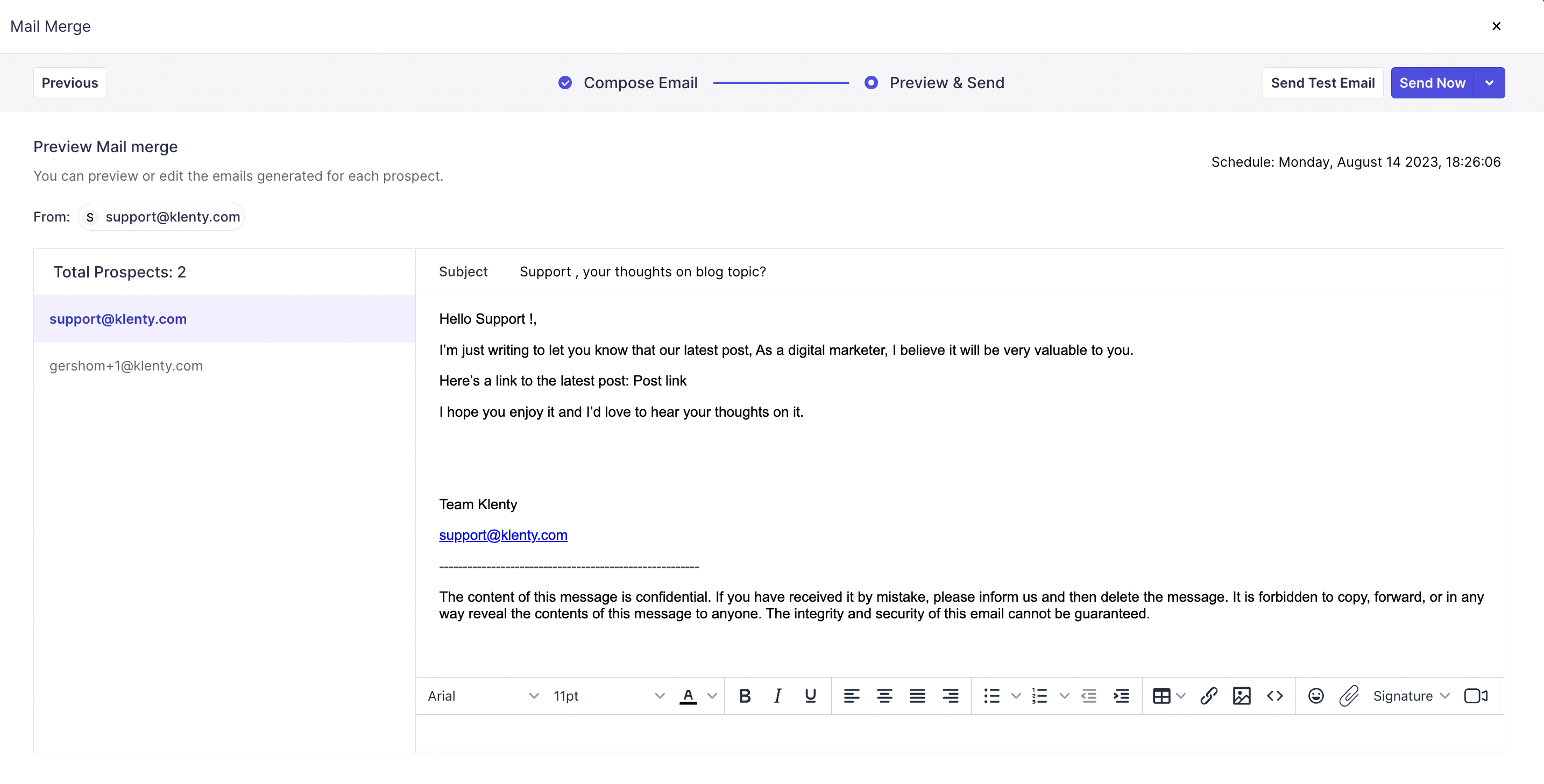Upon finalising the email content, you'll need to select the option Preview and Send where; you get to preview your prospects and their emails to understand if these emails are generated according to your personalization.