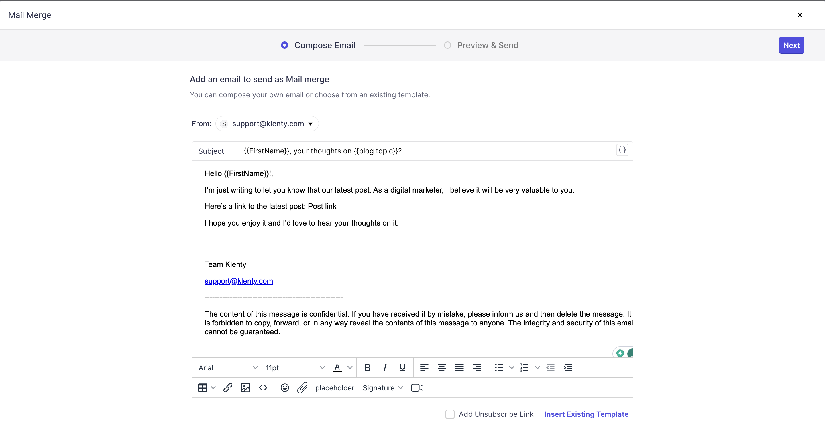 An email compose section pops up upon selecting the option Mail Merge just like how you get to add email content for your cadences.