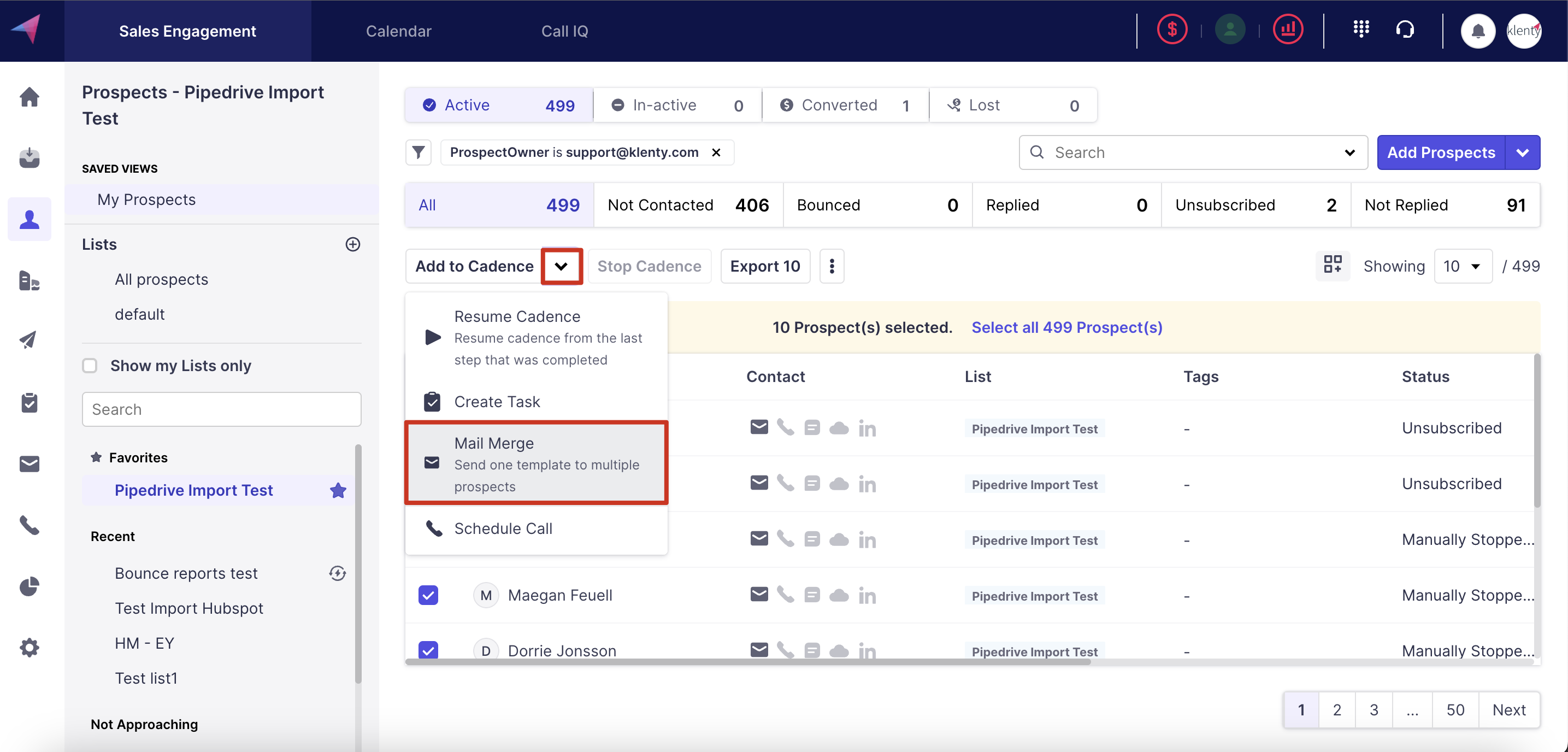 Upon heading to the main prospects page, you'll have a plan to send out emails to a list of prospects that are part of a list or are part of a tag. You can choose those prospects of your choice by accessing the check box and then, select the add to cadence drop-down to view options such as: