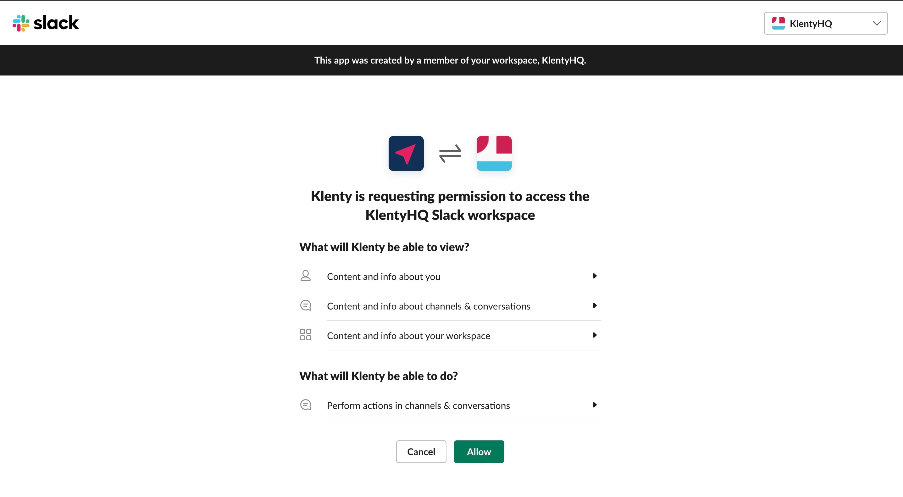 3. Login to Slack if required and click on Allow to provide Klenty with permissions to send to Slack