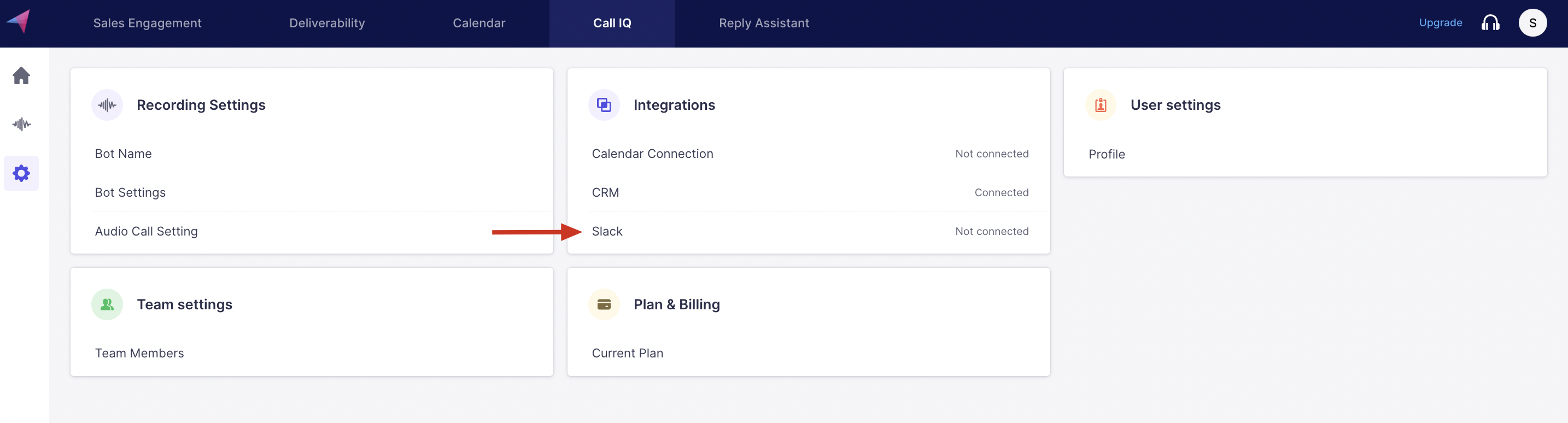 Navigate to Call IQ Settings--> Integrations--> Slack